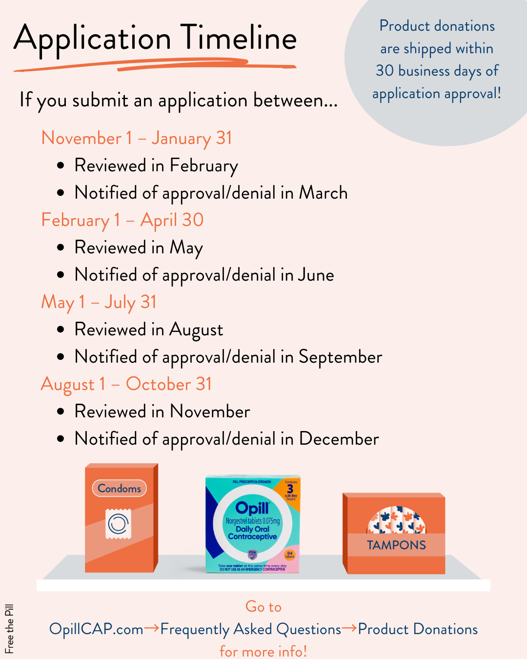 Perrigo, the pharmaceutical manufacturer of Opill, operates an in-kind bulk donation program for eligible organizations to receive free OTC birth control pills for the purpose of community distribution. Organizations can submit an application to request a donation once per calendar year. Specific quantities of 1-month and/or 3-month packs may be ordered based on available inventory listed on the application, but cannot be guaranteed.