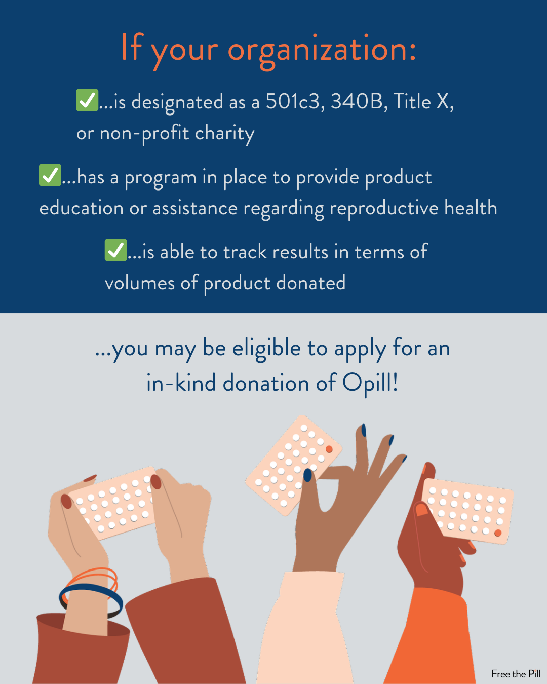 Did you know that eligible organizations can receive free Opill to distribute in their communities? That's right! Over 70 organizations are actively distributing OTC birth control pills across the country. Here's how your organization can get involved: